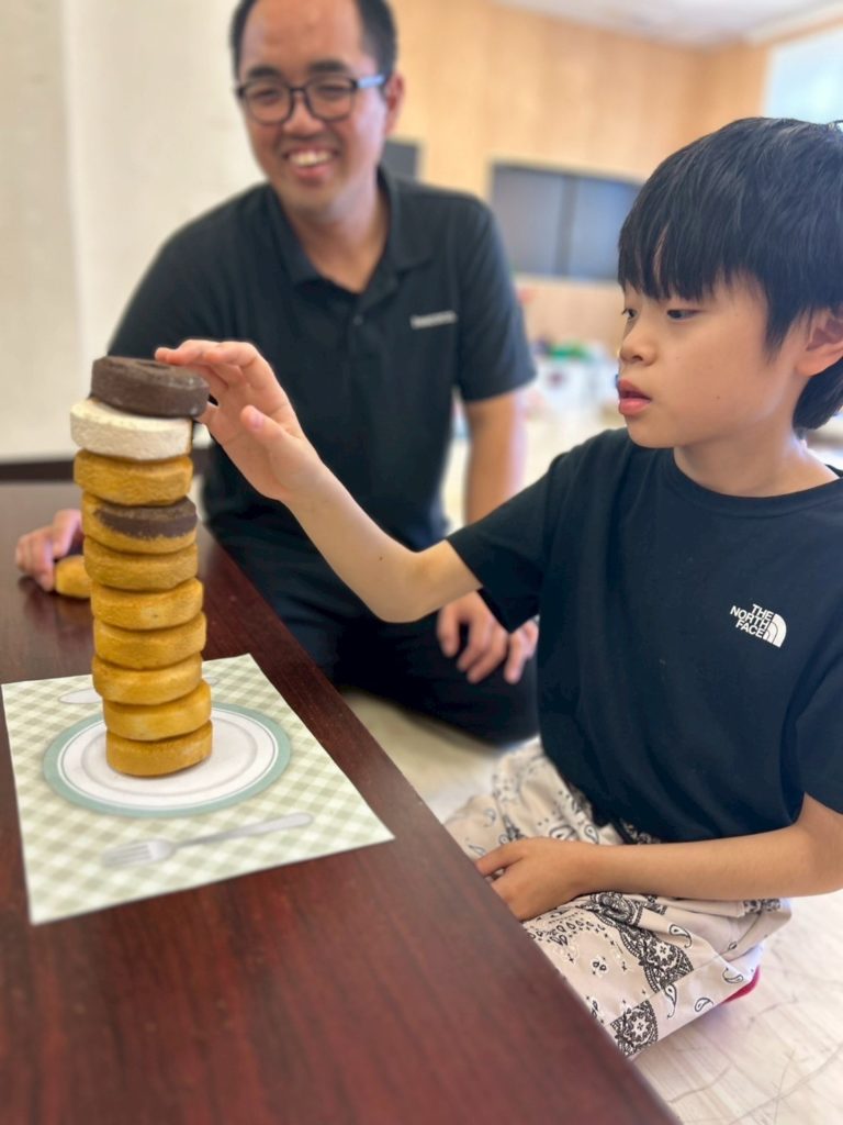 美味しそうなドーナツに見立てたスポンジをたくさん用意し、積み上げていくバランスゲームで、まずはどこまで積み上げられるか、挑戦しました。