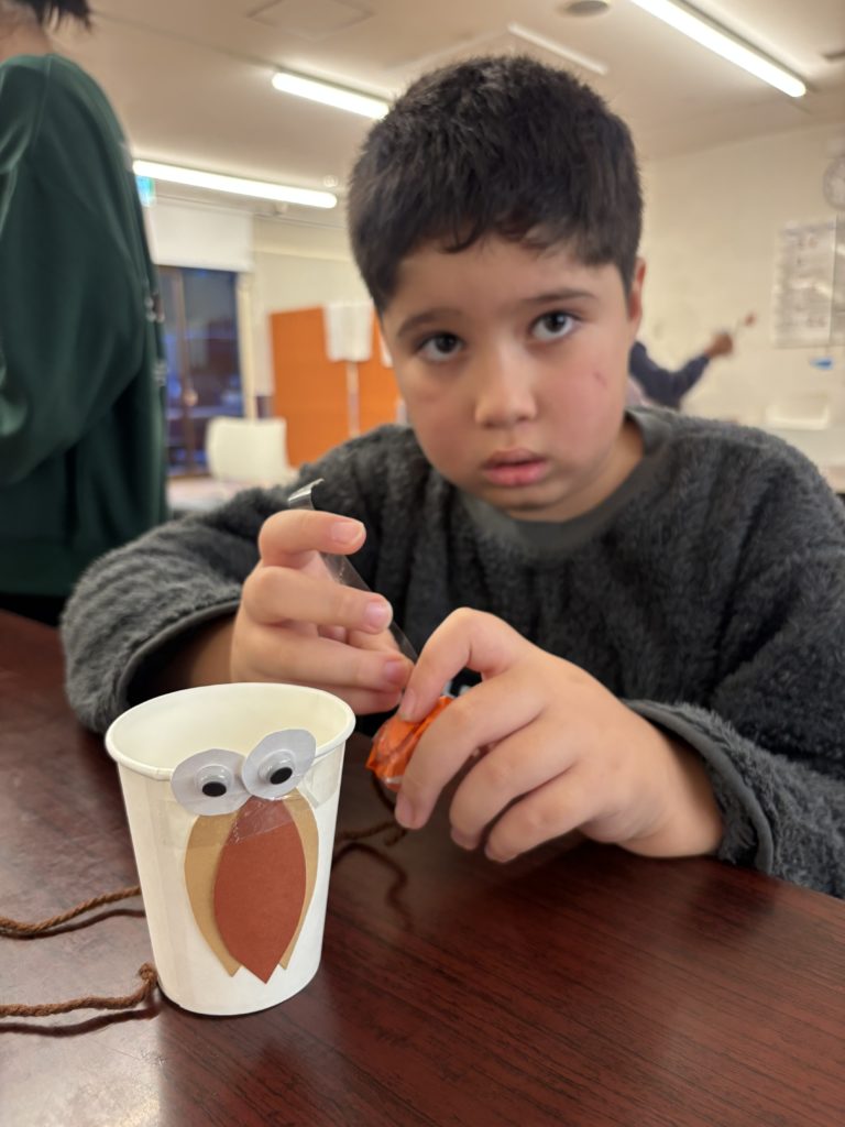 いまここup:ミノムシ紙コップけん玉作りNEWS、いまここup ブログ 11月13日(木)に活動で〔ミノムシ紙コップけん玉作り〕を行いました🍁🍂紙コップに目・羽のパーツをのりとセロハンテープで付けました。完成した児童から自分で作った作品で遊んでおられましたよ🎶「先生みてみて!入ったよ!」と、笑顔で伝えてくれる児童がたくさんいました☺️活動のねらい〈季節にあった作品を作る・手先の器用さを養う〉を目的に、とても集中して作品を作ることができました✨️