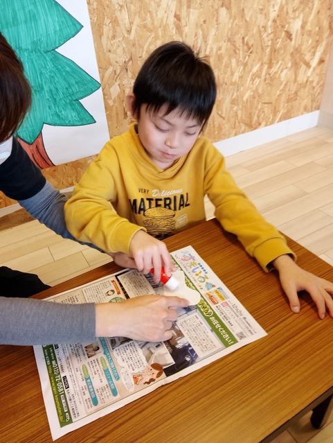 お部屋を飾るお友達は大きなクリスマスツリーが描かれた模造紙に、クリスマスらしいイラストをペタペタと貼っていきました。